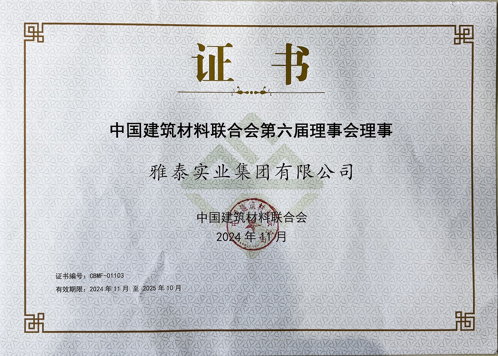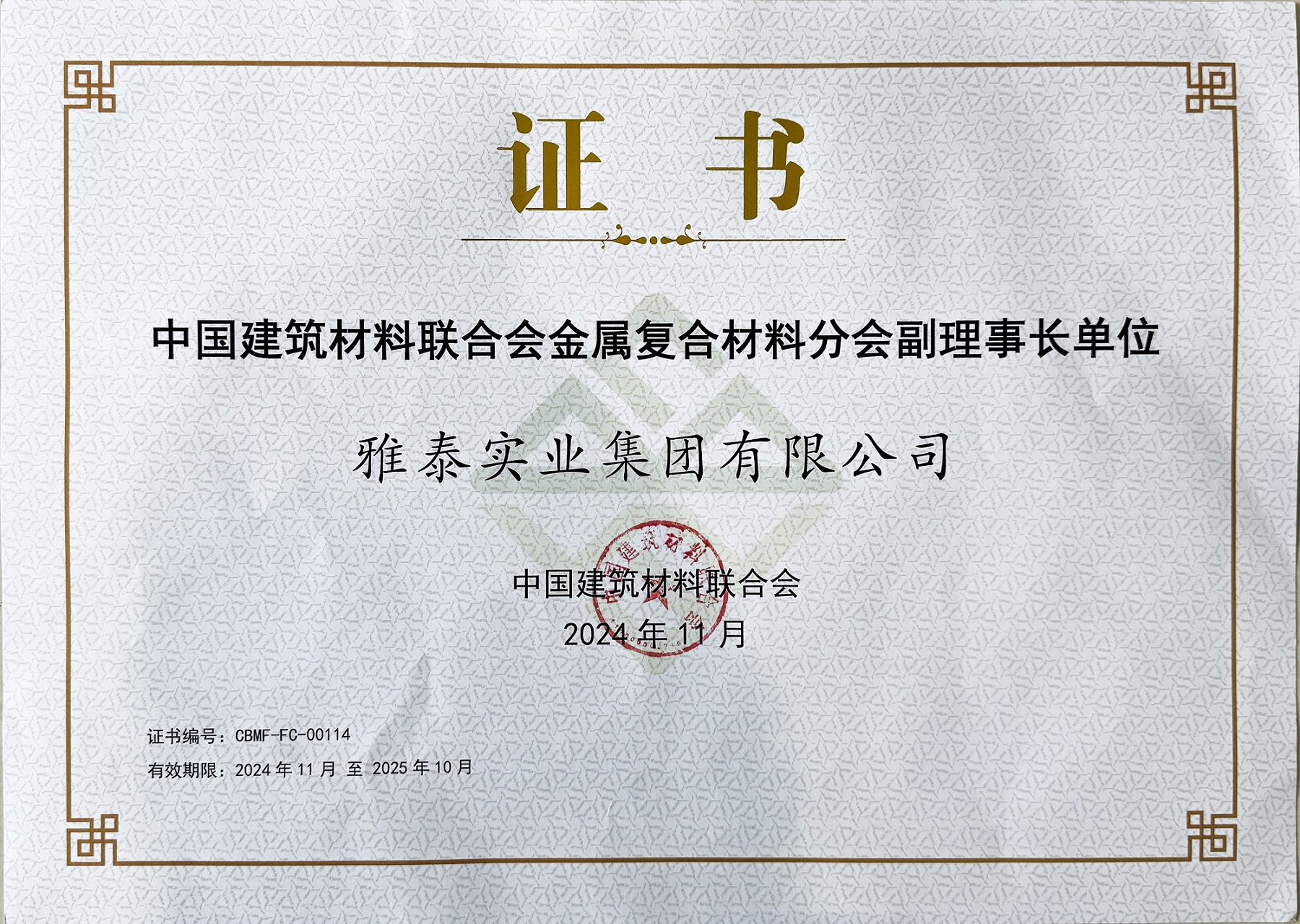 同時,雅泰實業集團作為幕墻行業優秀的國內老字號品牌,也長年擔任著中國建筑材料聯合會理事、金屬復合材料分會副理事長等角色。