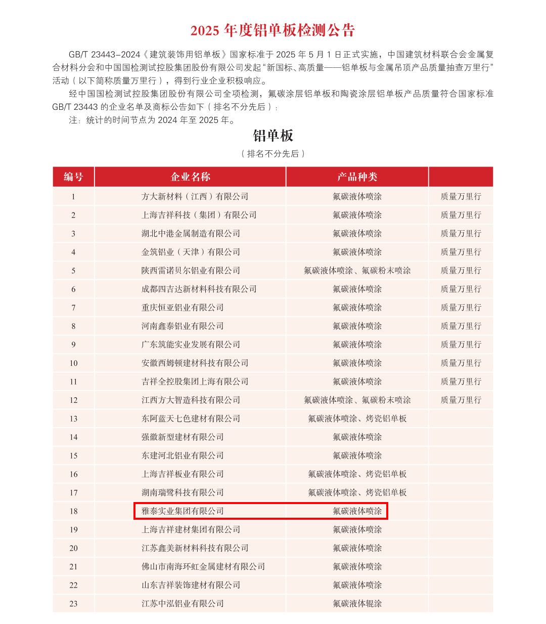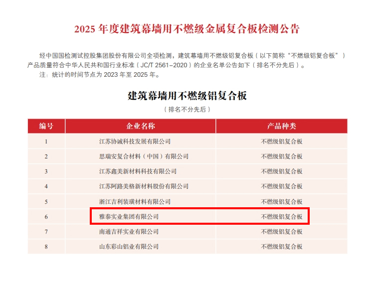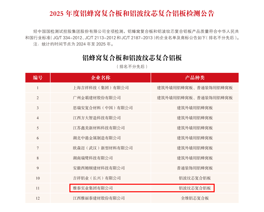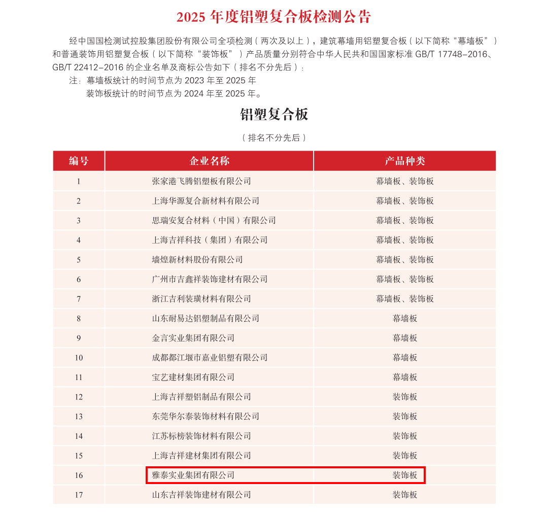 為加強金屬復合材料行業品質建設,提高行業整體質量,金屬復合材料分會聯合中國國檢測試控股集團股份有限公司對符合全項檢測要求的鋁塑復合板、鋁單板、建筑裝飾用不燃級金屬復合板、鋁蜂窩復合板和鋁波紋芯復合鋁板等生產企業頒發2025 年度產品合格證,具體公告如下: