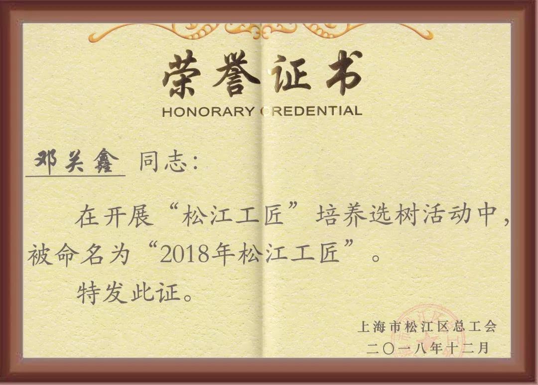 【熱烈祝賀】鄧關鑫榮獲首屆“松江工匠”榮譽稱號